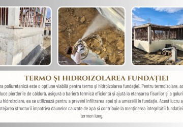 - Aplicarea mecanizată a spumei poliuretanice pe suprafețe verticale sau orizontale pentru a asigura o barieră eficientă împotriva apei.